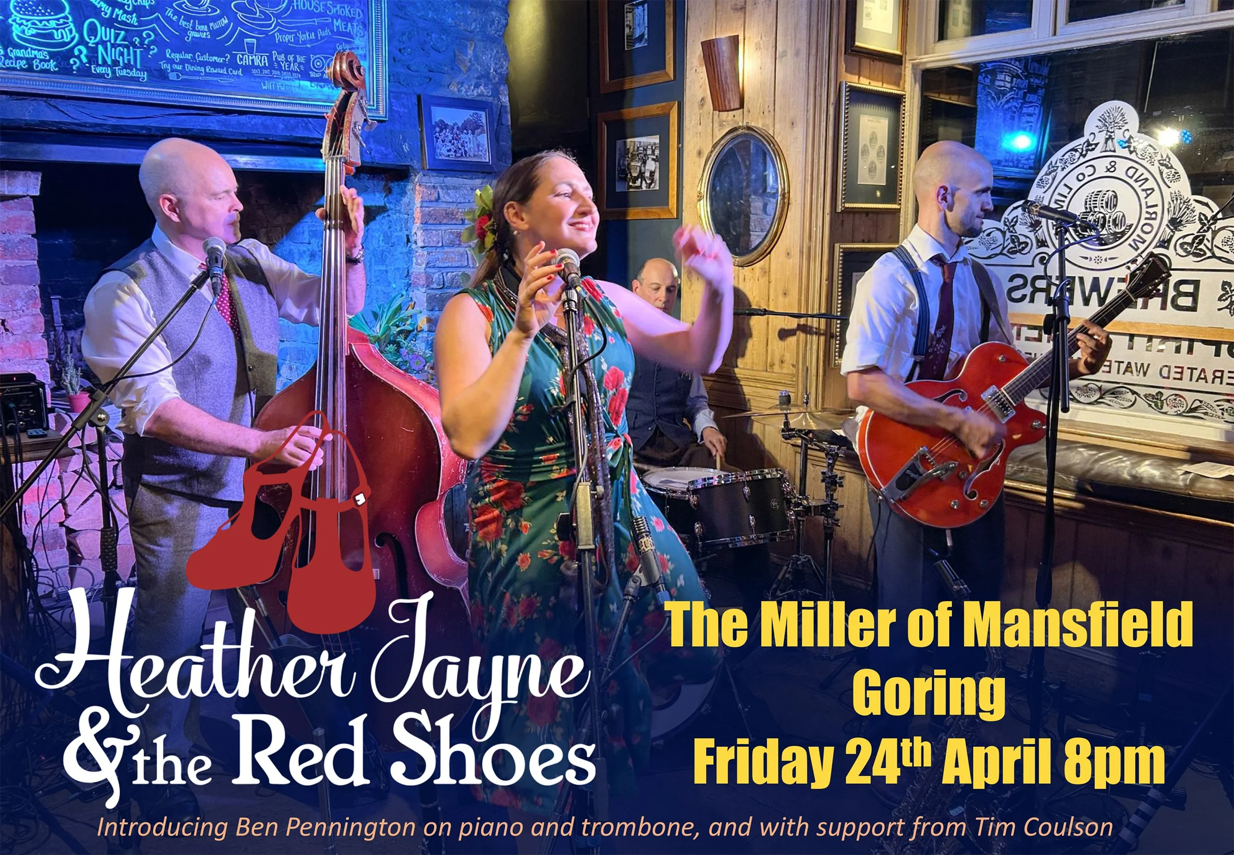 Heather Jayne and the Red Shoes. Berkshire based 4 piece playing Soul, Jazz, Blues, Swing and whatever else we can get our hands on. Instruments: guitar, double bass, vocals, sax, flute & clarinet.